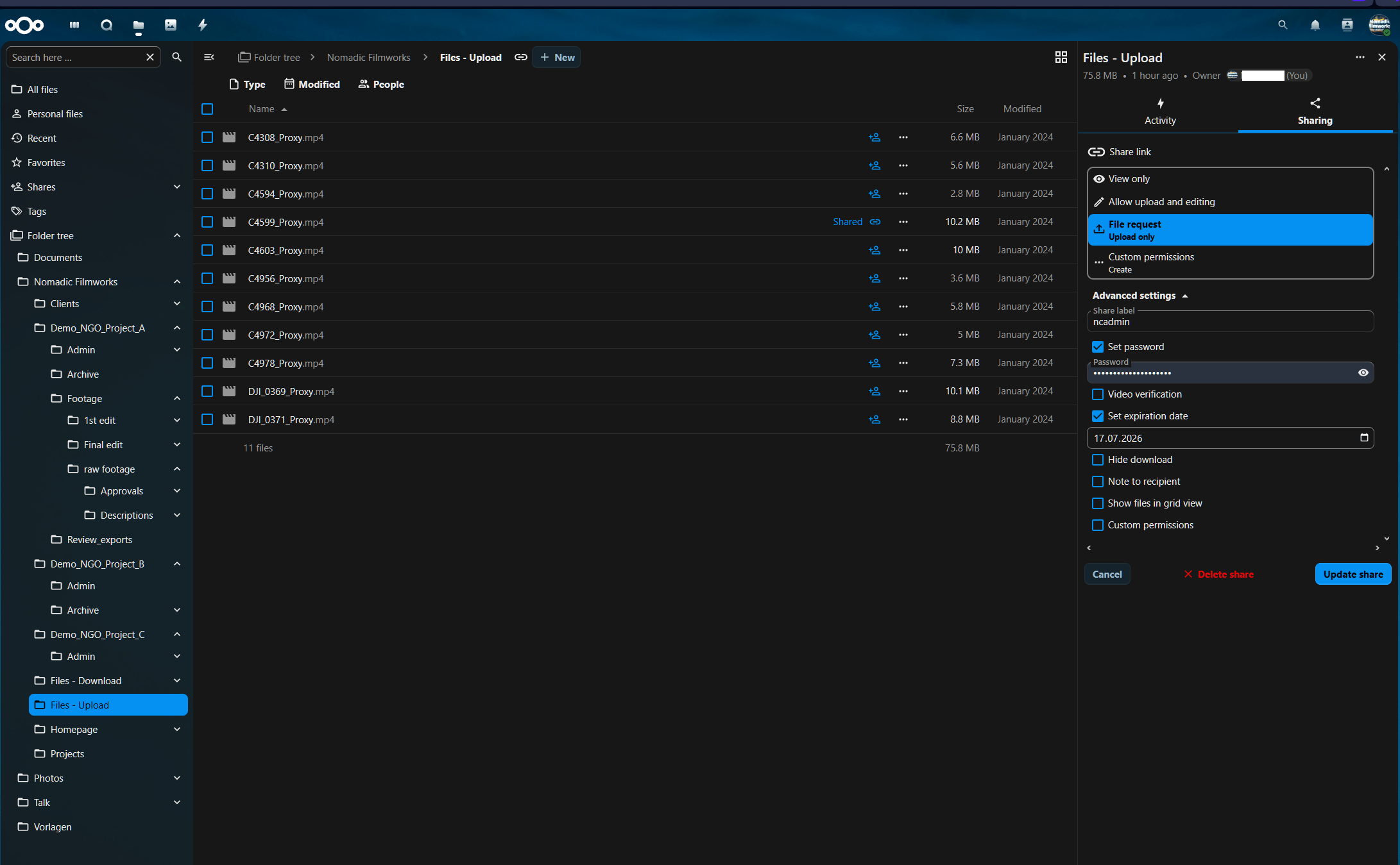 Use Nextcloud File Drop (upload-only) with a password and a short expiration date. No browsing, no link sprawl.